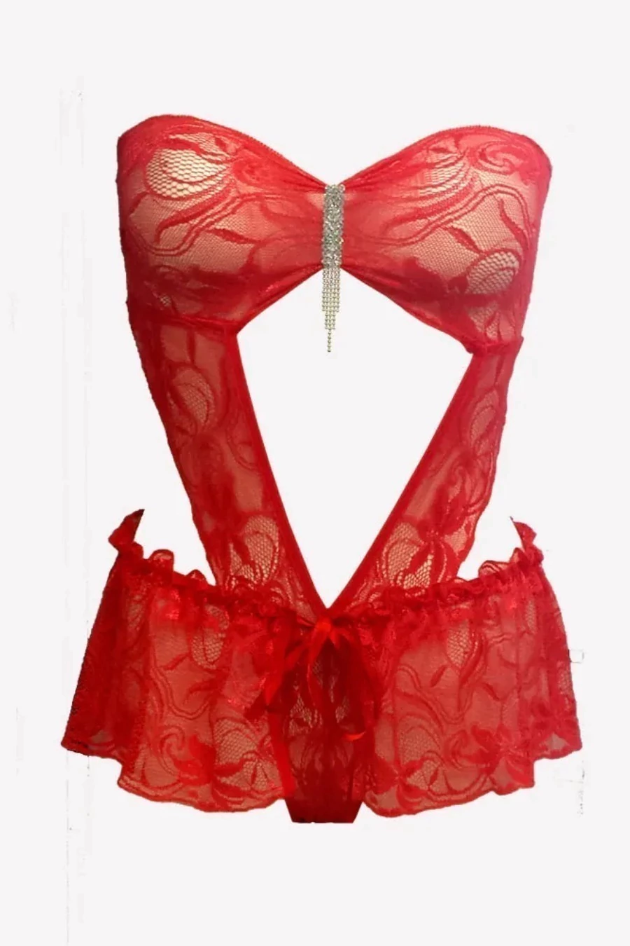 Ref.: Body Bonito! - Body tomara que caia em renda com saia. Detalhe em biju na frente. Luxo e sensualidade!