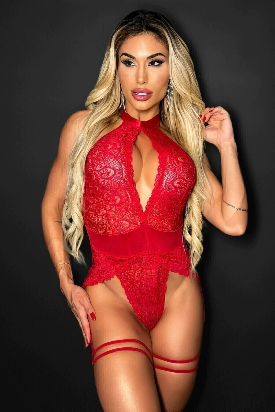 "...Saudade de ontem, de você beijando pra baixo do meu umbigo..." Feito de renda vermelha e com detalhes em cirre, modelo cavado, com ligas fixas nas laterais para te deixar ainda mais fatal. E o melhor da peça é a ousada abertura que tem no fundo da calcinha.