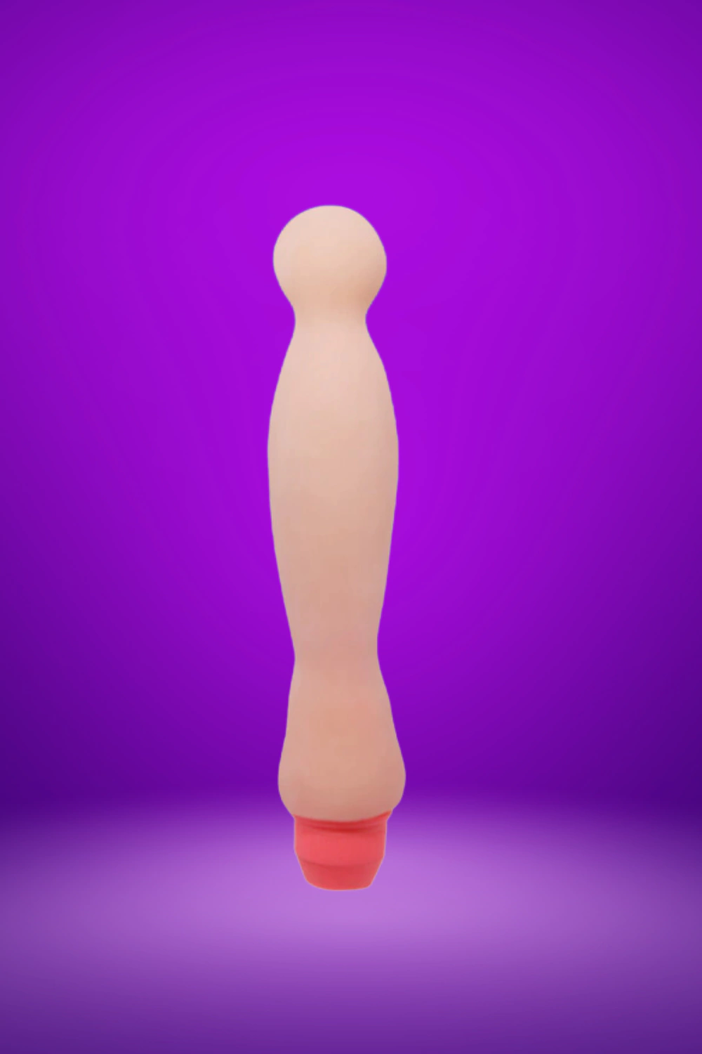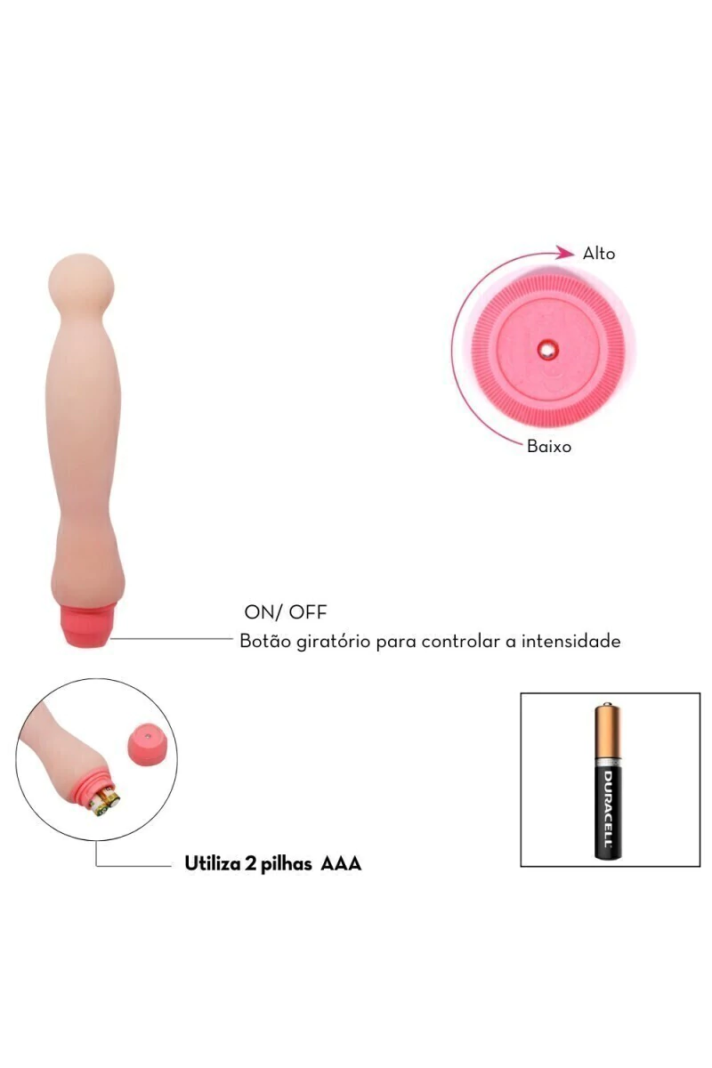 Vibrador prótese peniana com formato anatômico, ponta arredondada com vibro e vertebra flexível.